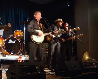 v.l.n.r.: Benny Korn, Paul Leegan, Lutz Eikelmann, Warren James, Foto: Angelika le Vrang Es folgte der Railroadsong “The Wreck Of The Old 97“, dann der Skiffle-Klassiker “Midnight Special”, den Paul Leegan zu neuem Leben erweckte, obwohl die Nummer durch zehntausende Hobby-Skiffler und Lagerfeuer-Gitarristen bereits zu Tode geschrubbelt worden zu sein schien. Der sehr charismatische Donegan-Freund Paul Leegan fesselte die Zuschauer durch seine unterhaltsame und zugleich informative Ansagen und ließ es auch an seiner Freude teilnehmen, stolzer Besitzer einer Lonnie-Donegan-Skiffle-Gitarre zu sein, von der der amerikanische Gitarrenhersteller Martin 2002 nur 72 Modelle herstellen ließ, allesamt handsigniert von Lonnie selbst. Paul berichtete, dass sein Exemplar am 30. Oktober 2002 geliefert wurde, er dann am Nachmittag dieses Tages Lonnie Donegan vor seinem Konzert in Nottingham aufsuchte und Lonnie die erste Person war, die auf dieser Gitarre spielte an diesem Nachmittag ahnte noch niemand, dass Lonnie nach dem abendlichen Konzert kollabieren und nur wenige Tage später am 3. November 2002 sterben würde... Es ging weiter mit dem 1960er Donegan-Hit “I Wanna Go Home“, der auf einem von den Bahamas stammenden Shanty ( “The Sloop John B.“ ) basiert, dann griff Paul Leegan wieder zum Banjo und bot Lonnies 1957er Nr.1-Hit “Putting On The Style“ dar. Dann beschloß er seine Serie mit einem weiteren Gospel-Medley “Down By The Riverside“ / “This Train“ / “When The Saints Go Marching In“, in welchem alle Begleitmusiker, Warren James, Bastian & Benny Korn sowie Lutz Eikelmann solistisch zum Zug kamen. Nun kam Lonnies ältester Sohn Tony Donegan ( geboren am 8.November 1967 ) auf die Bühne, begleitet von seinem exzellenten Gitarristen Dean Smith, dem virtuosen indischen Bassgitarristen John de Silva, wohnhaft in Hagen-Hohenlimburg, Bastian und Benny Korn sowie Lutz Eikelmann, der diesmal Tamburin, Shake, Waschbrett und Train Whistle bediente. Tony, der seinen Vater Ton für Ton zu kopieren sucht, eröffnete seine Serie mit den gleichen Titeln, die der alte Donegan jahrzehntelang als Warm-Up in seinem Live-Act verwendete: mit dem Worksong “Can´t You Line´em“, gefolgt von “New Burying Ground“ und dem “Worried Man Blues“.